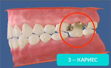 Смещаясь, зуб начинает притираться к соседним, повреждая эмаль — возникает кариес: